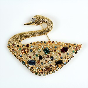 Goldfarbene Schwanen-Brosche von Swarowski (sig. Mit Schwanenpunze). Besetzt mit zahlreichen farbigen Strasssteinen in unterschiedlichen Formen und Größen, ca. 51 x 62 mm