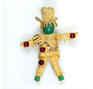 Goldfarbene Brosche von Florenza (signiert). Plastische Darstellung einer Vogelscheuche mit roten und grünen Glascabachons.