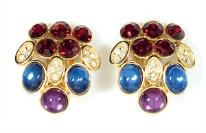 Farbige Ohrclips von SPHINX (signiert). Rote, blaue, violette und klare Glas- und Strasssteine in unterschiedlichen Formen.