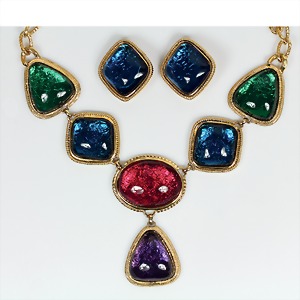 Massives goldfarbenes Set aus Collier und Ohrclips von Kenneth Jay Lane (sig K.J.L. for AVON). Mittelteil mit großen farbigen Kunststeinen in unterschiedlicher Form in Grün, Blau und Rot. Ohrclips in Blau, Collier ca. 47 cm, Clips ca. 41 mm