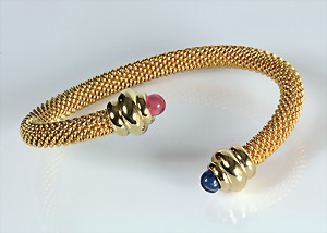 Sog. By-pass-Armspange von Saint Yves (bekanntes Design des Schweizerischen Herstellers, mit Etikett, unsigniert). Am Ende mit je einem roten und blauen Glascabochon. D innen ca. 68 x 55 mm