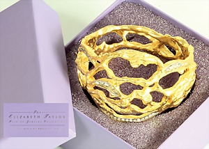 Sehr aufwendig gearbeitete Armspange der Luxusklasse von "Elizabeth Taylor" aus der "Treasured Vine" Serie. Das mit 22 Karat vergoldete Metallgeflecht ist z.T. besetzt mit klaren Strasssteinen. Sehr üppige und schwere Ausführung!!, D innen ca. 58 x 51 mm