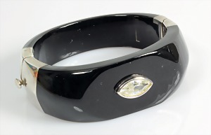 Schwarze Kunststoff-Armspange, in der Mitte mit einem klaren, geschliffenen Navette-Stein. Verschluss und Gelenk aus 925er Silber. D innen ca. 60 x 54 mm