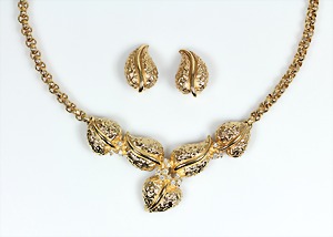 Set aus Ohrclips und goldfarbenem Collier von Henkel & Grosse Pforzheim (sig. Grosse). Erbskette, Mittelteil in Form von Blättern mit dezentem klaren Strassbesatz; Ohrclips im gleichen Blätterdesign. Collier ca. 45 cm, Clips ca. 7 cm