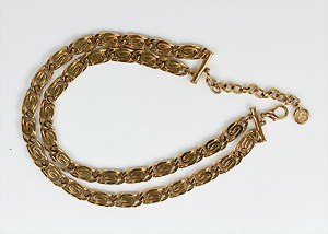 Doppelreihiges, goldfarbenes Flachpanzer-Collier mit verschlungenen Kettenelementen von GIVENCHY (Loge auf dem Aufhänger am Verlängerungskettchen). Massive Ausführung L = 34 cm plus Verlängerung ca. 7 cm