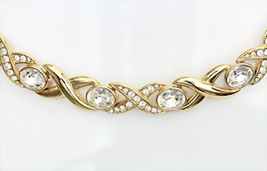 Goldfarbenes Collier mit ovalen, geschliffenen Steinen und gekreuzten Elementen mit klarem Strassbesatz., sig. MONET (USA). L = 47 cm