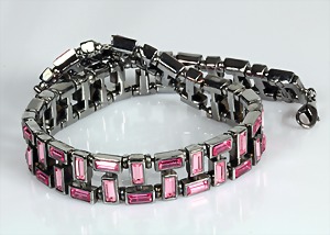 Üppiges silberfarbenes Strass-Halsband von Henkel und Grosse Pforzheim (sig. Grosse) mit zahlreichen rechteckigen, geschliffenen Steinen in Rose und Pink, geometrisch angeordnet. L = ca. 33,5 cm plus Verlängerungskettchen ca. 4,5 cm