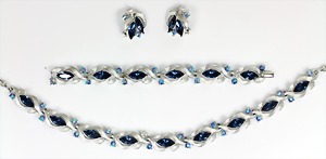 3-teiliges silberfarbenes Set aus Collier, Armband und Ohrclips von LISNER, USA (signiert). Klassische, florale Form mit dunkelblauen,geschliffenen Navettesteinen und kleineren, hellblauen Strasssteinen mit AB-Bedampfung. Collier ca. 44 cm, Armband ca. 18 cm, Clips ca. 29 mm