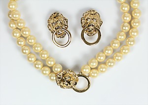 Set; Ohrclips und Kunstperlen-Collier von Kenneth Jay Lane (sig. K.J.L. for AVON). Clips und Verschluss des Colliers in Form von goldfarbenen Löwenköpfen im " Doorknocker-Stil ". Collier ca. 42,5 cm, Clips ca. 44 mm