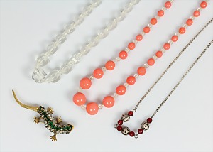 Lot: 2 Böhmische Glasketten; 1 Brosche "Salamander", Metall verg., Strass; 1 Silberkette 835/000 mit Karneol, L = 41 cm