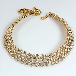 Üppiges, goldfarbenes Strass-Halsband mit zahlreichen runden Steinen. Unsigniert. Verlängerungskettchen und Hakenverschluss. L = 41 cm