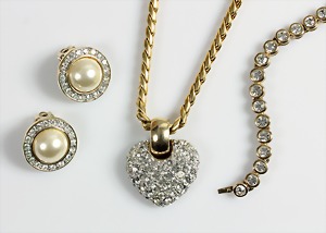 Lot: Metall verg., weißer Strassbesatz, Armband L = 20 cm; Collier mit herzförmigem Anhänger, L = 59 cm; Ohrclip mit 1/2 Perlen, D = 21,5 mm