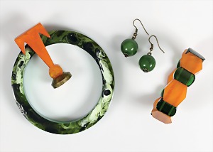 Lot: 1. Hälfte 20. Jhd., 1 x Armreif, grün mamorierter Kunststoff, Innen D = 68,5 mm; 1 x Armband auf Zugband gefädelt, mehrfarbiger Kunststoff ( orange / grün), Innen D = 50,5 mm; 1 x Ohrhänger, Kugel D = 16,0 mm; 1 x Pettschaft, Messsing, orangefarbener Kunststoff, H = 55,2 mm