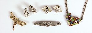 Lot Modeschmuck: 2 x Brosche/Nadel; 1 x Ohrclips; 1 x Kette, 41,0 cm; Strasssteine
