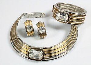 Set: Modeschmuck MONET New York - London - Paris: Armreif mit großen zentralen Strassstein, Kastenschloß mit Bewegung, Innen 55,5 x 48 mm; Ohrclips, H = 33,5 mm, Halsreif mit großen zentralen Strassstein, hinten sind die Bügel zum Wegklappen