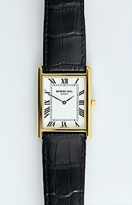 Herrenarmbanduhr, REIMOND WEIL Swiss Geneve, 18 K elektroplatet, weißes Zifferblatt, röm. Index, orig. Band mit Dornschließe