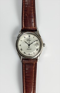 Herrenarmbanduhr der Fa. JAKOB, Automatik, Edelstahlgehäuse, geschraubter Boden mit Glas, fein strukturiertes Ziffernblatt mit röm. Index, Zentralsekunde, Datumsfenster mit Lupe Lederband mit Dornschließe, D = 37 mm, Uhr läuft