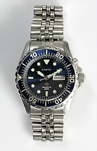 Herrenarmbanduhr, SEIKO KINETIK SPORTS 200, Automatik, Zentralsekunde, Tag/Datum, Zeiger u. Index nachtleuchtend, Stellring, verschraubte/r Krone/Boden, D = 42,0 mm, Stahlband und Faltschließe mit Seitendrückern zum Öffnen, Uhr läuft