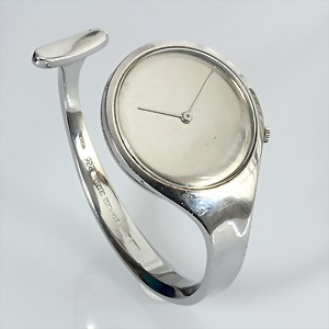 Uhrenspange, signiert: GEORG JENSEN STAINLESS DENEMARK 226, Handaufzug, Werk: L.U.CHOPARD & CIE GENEVE, 17 Jewels, schlichte Zeiger, Boden verschraubt, innen ca. 54,5 x 45 mm, formschön ! Uhr läuft
