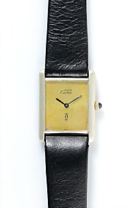 Damenarmbanduhr,must de CARTIER "Tank", No.6 184013, Silbergehäuse, strahlenförmig, goldfarbenes Ziffernblatt, Krone mit blauem Stein, Lederband mit Dornschließe (nicht orig), Uhr läuft