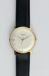 Herrenarmbanduhr, JUNGHANS, Handaufzug, GG 585/000, Strichindex, Zentralsekunde, Originallederband mit Dornschließe, Lagerware aus Geschäftsauflösung, ungetragen, Uhr läuft