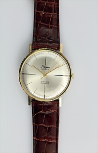 Herrenarmbanduhr, STOWA, Handaufzug, GG 585/000, Strichindex, Zentralsekunde, Originallederband mit Dornschließe, Lagerware aus Geschäftsauflösung ungetragen, Uhr läuft