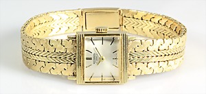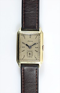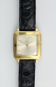 Herrenarmbanduhr, Handaufzug, GG 585/000, Strichindex, eckiges Gehäuse, Kal.WP 2390, Lederband mit Dornschließe, Uhr läuft