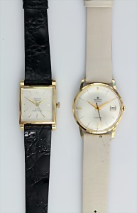 Lot: Herrenarmbanduhren, 1 PROVITA, Handaufzug, GG 585/000, Strichindex, Zentralsek., eckiges Gehäuse, Boden mit Scharnier, (Glas nicht optimal fest), Krokoband, Uhr läuft; 1 PRONTO, Automatik, GG 750/000, Strichindex, Zentralsek, Datum auf 3 Uhr, Uhr läuft nicht, beide mit Lederband und Dornschließe,