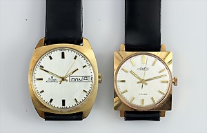 Lot: Herrenarmbanduhren, 1 ARCTOS, Handaufzug, goldplattiert, Strichindex, Zentralsek., eckiges Gehäuse, Stahlboden; 1 STOWA, Automatik, goldplattiert, Strichindex, Zentralsek, Datum/Wochentag auf 3 Uhr, (Wochenscheibe stellt nicht um),Uhr läuft, beide mit Lederband und Dornschließe, Lagerware aus Geschäftsauflösung, ungetragen, ungeprüft