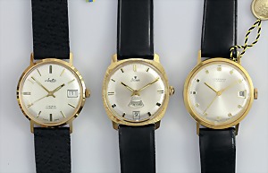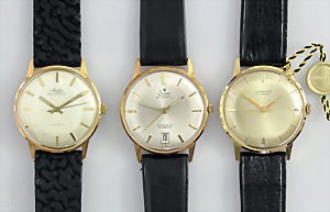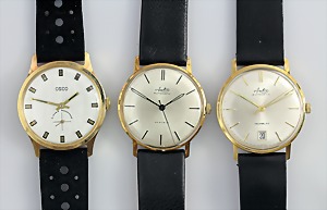 Lot: Herrenarmbanduhren, 1 ARCTOS, Automatik, goldplattiert, Strichindex, Zentralsek., gedrückter Stahlboden; 1 OSCO, Handaufzug, Goldplattiert, Strichindex, kl.Sek. Auf 6 Uhr, verschraubter Stahlboden; 1 ARCTOS, Automatik, Zentralsek., Datumsfenster auf 6 Uhr, gedrückter Stahlboden, alle Uhren mit Lederband und Dornschließe, Lagerware aus Geschäftsauflösung, alle Uhren laufen