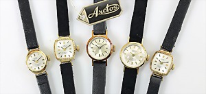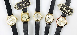 Lot Damenarmbanduhren: GG 585/000, 2 x ARCTOS (5 1/2" OTERO 262 / 5 1/2" AS 1977); 2 x EMP; 1 x ORLY, Handaufzug, alle Uhren mit Lederband und Dornschließe, Lagerware aus Geschäftsauflösung, ungetragen, ungeprüft