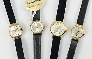 Lot Damenarmbanduhren: GG 585/000, 1 x JUNGHANS; 1 x EMP; 2 x ORLY, Handaufzug, alle Uhren mit Lederband und Dornschließe, Lagerware aus Geschäftsauflösung, ungeprüft