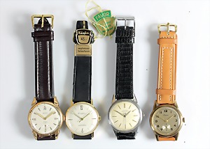 Lot: 4 Stück, Herrenarmbanduhren, 1960/70 Jahre, Stahl/Gold, 1 Kiefer, 1 Junghans Chronometer, Zentralsek., 1 Porta, 1Stowa, alle Uhren mit Lederband und Dornschließe, aus Geschäftsauflösung, ungetragen, Uhren laufen
