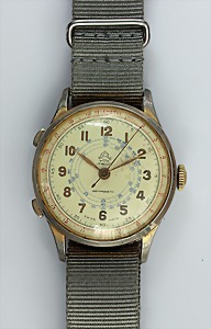 Herrenarmbanduhr, ROCAR DE LUXE 1930er Jahre, Chronograph, Handaufzug,Telemetre / Tachymetrescala, Drücker links !, D = 38 mm, Stoffarmband Uhr läuft
