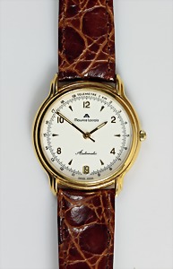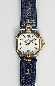 Damenarmbanduhr, MAURICE LACROIX, Quarz (ETA), weißes Ziffernblatt, röm. Zahlen, Zentralsekunde, Datum auf 6 Uhr, Stahl/Gold, gedrückter Boden, orig. Lederarmband mit Dornschließe, Uhr läuft (neue Batterie), Papiere u. Originalschatulle