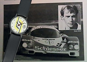 Herrenarmbanduhr, "FORMEL 1", 1984 wurde diese Uhr in einer Auflage von 50 Stück (Sonderserie) über den Sponsor (Fa. Schießer) des deutschen Formel 1 Rennfahrers "STEFAN BELLOF", unter den Rennfahrern und Boxenteam in der Boxengasse verteilt (Hockenheim !), Quarzwerk, Zentralsek., D = 29,5 mm, Lederband mit Dornschließe, Uhr läuft !