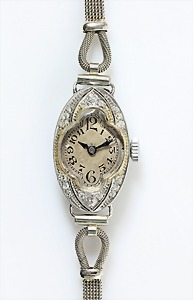 Damenarmbanduhr ART DECO, Gehäuse Platin, Band WG 585/000, 18 Altschliffdiamanten ca. 0,33 ct weiß, Deckel graviert: Mama 24.12.36, ausgefallen gestaltetes Gehäuse mit speziell eingeschliffenem Glas, geschmeidiges Band mit Klappschließe und Sicherheitsacht, L = 17,0 mm