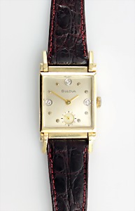 Damenarmbanduhr ART DECO 1940er Jahre, BULOVA Watch & Co New York, GG 585/000, Punktindex davon 9/12 u.3 Uhr mit Diamantbesatz, kl. Sekunde auf 6 Uhr, Kal: 8 AE, Gehäuse ca. 20,0 x 21,0 mm, Breguetspirale, Lederband mit Dornschließe, Uhr läuft