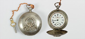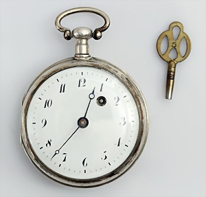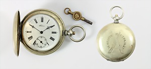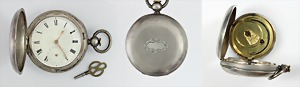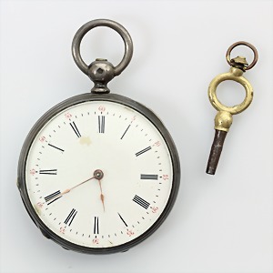 Herren Schlüsseltaschenuhr ENGLAND um 1880/1900, K. SERKISOFF CONSTANTINOPEL, Uhr für Türkischen Markt hergestellt, auf Werk sig: BILLODES, Silber 800/000, E.Z.Blatt mit ausgebesserter Fehlstelle, plastischer Kranz auf Uhrendeckel, gebläute Zeiger, röm. Zahlen, kl. Sekunde auf 6 Uhr, D = 53,0 mm, 1 Uhrenschlüssel, Uhr läuft