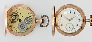 Herren Taschenuhr Anfang 20.Jhd., Handaufzug, GG 585/000, weißes E.Z.Blatt, arab. Zahlen, kl. Sekunde auf 6 Uhr, Staubdeckel = Metall, Breguetspirale, geschraubtes Minutenrad, D = 54,0mm, Uhr läuft