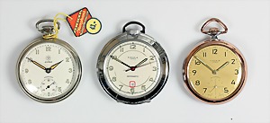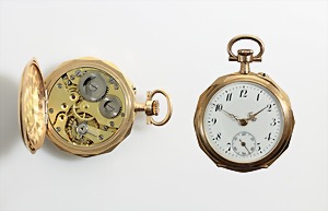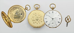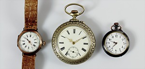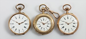 Lot: 1 Damentaschenuhr, D = 33 mm; 1 Damentaschenuhr als Armbanduhr umgebaut; 1 Herrentaschenuhr, hinten reich verziert, D = 53,0 mm, Uhren müssen überholt werden