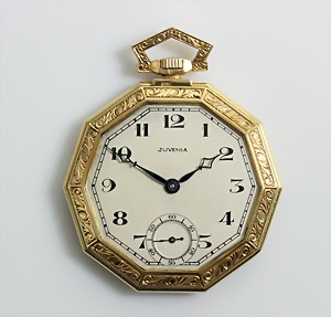 Herren-Taschenuhr, JUVENIA 1.Hälfte 20.Jhd., Handaufzug, GG 750/000, champagnerfabenes Ziffernblatt, gebläute Kathetralzeiger, arab. Zahlen, kl. Sekunde auf 6 Uhr, ausgefallenes 8-eckiges Gehäuse, Außenränder graviert, D = 42,5 x 44,5mm, Uhr läuft