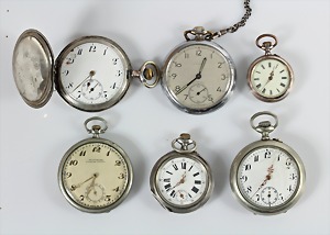 Lot: 6 Stück Damen u. Herrentaschenuhren u. a. 1 KIENZLE, kl. Sek. Auf 6 Uhr, D = 49,0 mm, Uhr läuft, 1 Uhr ART DECO, signiert: A. JAKOB OSIJEK l, D = 48,5 mm, Uhr läuft, andere Uhren teilweise in Silber, D = 31,5 - 50,5 mm, Uhren laufen
