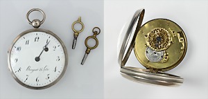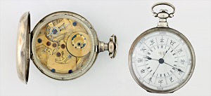 "DUPLEXTASCHENUHR" um 1830/50, sehr gut erhaltenes E.Z.-Blatt, gebläute feine Zeiger, innen 2 x 12 Std. Anzeige mit röm. Index (sehr klein), nach außen versetzt größere chinesische Schriftzeichen, Werk feuervergoldet, gebl. Schrauben, das kunstvoll gravierte Uhrwerk ist durch ein Kunststoffglas abgedeckt und damit sichtbar, die Uhr wurde für den Chinesischen Markt hergestellt ! D = 66,0 mm, Uhr schwingt nur kurz an und sollte überholt werden !