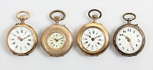 Lot: 4 Damentaschenuhren, um 1900, 3 Stück GG 585/000, Emaille Z.B., 1 Stück Silber, D = 28,8 - 29,8 mm, sehr guter Zustand, Uhren laufen nicht ( wohl verharzt ?)