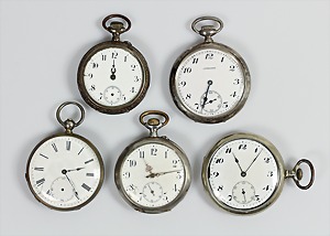 Lot: 5 Stück Herrentaschenuhren, u. a.1 KIENZLE mit gebläuten Zeigern, kl. Sek. auf 6 Uhr, D =51,0 mm, ungeprüft !