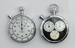 Lot: 2 Additionsstopuhren: 1 HANHART, 3 Juwels, 60 SEC, Metallgehäuse, D = 55 mm; 1 HANHART, schwarzes Ziffernblatt mit weiß abgesetzten Anzeigen, 7 Juwels, 60 Sek., 1/10 Sekunde !!!, Metallgehäuse, D = 55 mm;