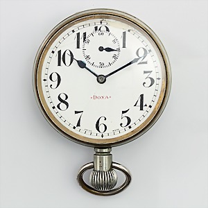 Eisenbahnertaschenuhr, DOXA Swiss, gestempelt: Argentan, Emaille E.Z.Blatt mit Fehlstelle, feine Risse, gebläute Zeiger, arab. Zahlen, kl. Sek. auf 6 Uhr, Werk mit Kunststoffglas u. Staubdeckel (Metall) geschützt, D = 65,5 mm, Uhr läßt sich nicht aufziehen !
