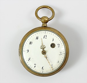 Spindeltaschenuhr, 1.Hälfte19.Jhd., Metallgehäuse, E.Z.Blatt auf 6 Uhr ausgebessert, arab Zahlen, filigran gearbeitete Spindelbrücke, D = 47,5 mm, Uhr läuft