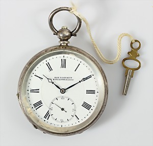 Herren-Schlüsseltaschenuhr, KAY JONES & Co WORCHESTER, MADE IN LOCLE, Silber 935/000, sehr gut erhaltenes E.Z.Blatt, gebläute Kathedral-Zeiger, röm. Zahlen, kl.Sekunde auf 6 Uhr, D = 54,0 mm, Deckel versetzt zu Öffnen, 1 Uhrenschlüssel, Uhr läuft
